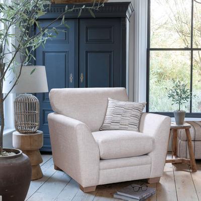 The Aldworth armchair features clean lines and gently curved arms, perfect for living rooms or reading nooks without compromising on comfort. The look is elevated by the scatter cushion, adding a subtle pattern and contemporary flair.
