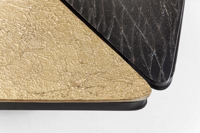 This coffee table boasts rounded edges and an attractively designed table top with a cleverly structured surface inspired by nature. A truly unique three-coloured composition.