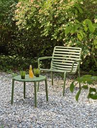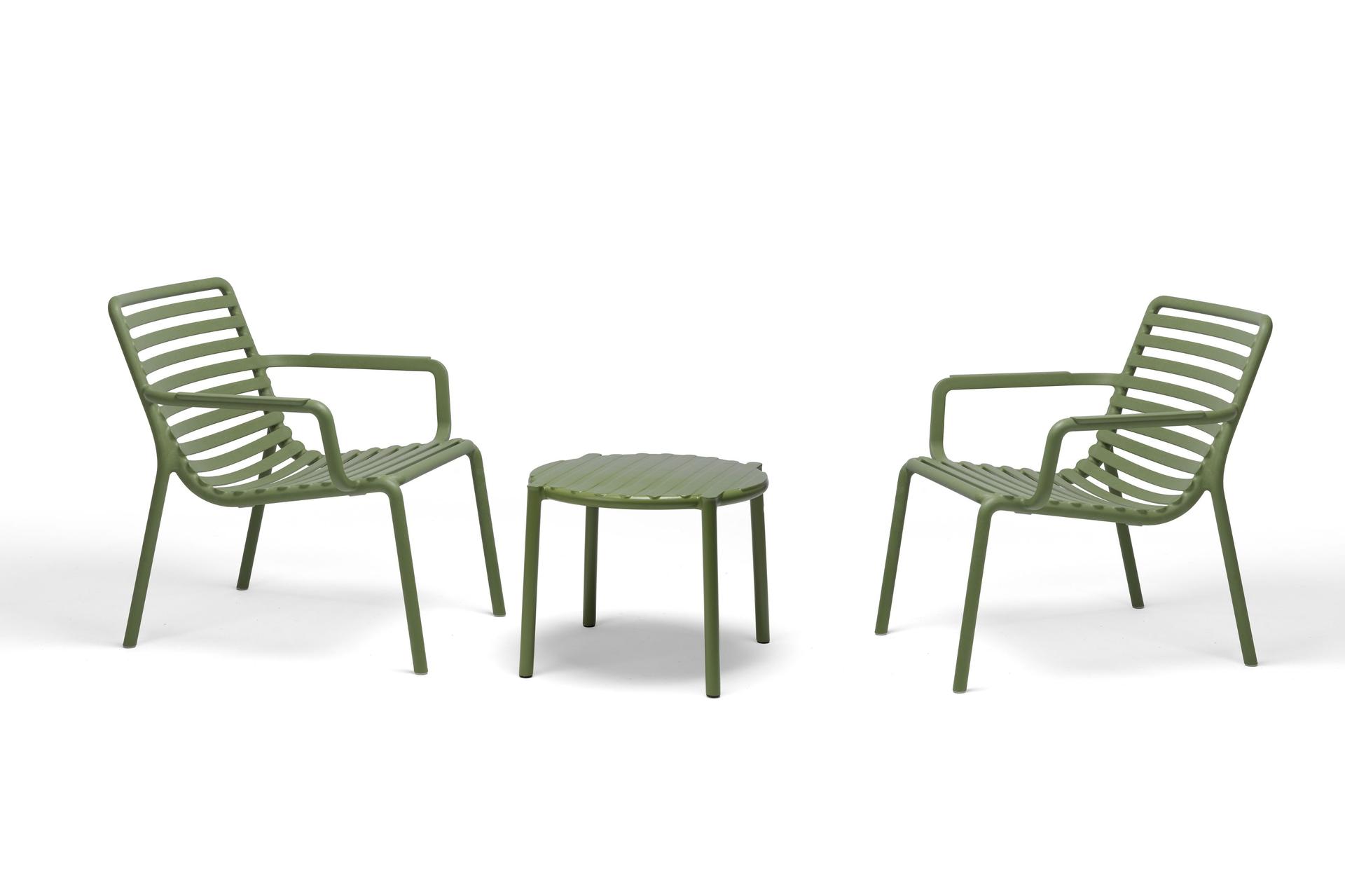 The slatted design is given a contemporary look for the Doga table, a monobloc low table in fibreglass resin with a round top and a new, lightweight design. It is handy to move, stackable, easily sanitised and entirely recyclable.