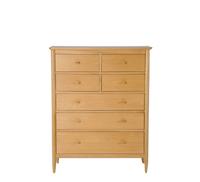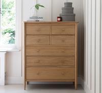 This seven drawer wide chest of drawers comprises the familiar tapered turned shapes in the legs and curved profiles on the top panel, as well as a shaker drawer layout, creating the simple signature feel