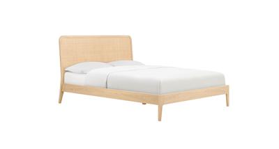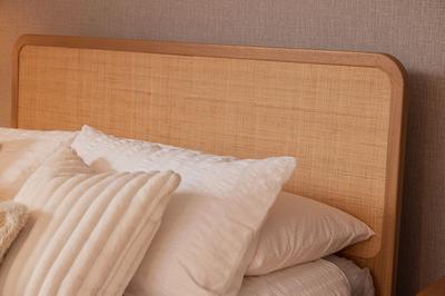 The Felton bed frame is a contemporary, understated piece featuring a handwoven natural rattan headboard and a rich American oak base. Pair with white or beige linens to create a calming oasis to escape to at the end of the day.