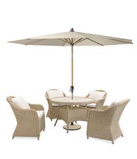 The set includes a round dining table, four comfortable armchairs and a parasol, combining durability, comfort, and contemporary outdoor style.