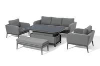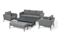 The Iris Sofa Lounge Set is a sophisticated and practical ensemble featuring a sofa, two armchairs, a stool, and a rising table. The perfect option for al fresco dining.