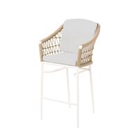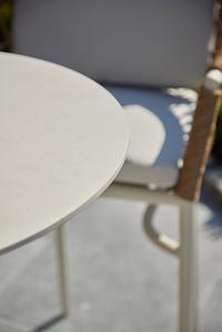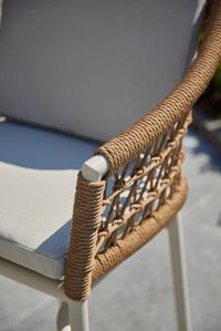 The soft colour palette creates a calming and inviting ambiance that effortlessly compliments any outdoor space. The woven texture of the rattan contrasts beautifully with the sleek finish of the aluminum table.