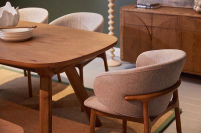 The Mae Dining Chair showcases soft curves, muted fabric and solid wooden legs for a contemporary look. Sit down and relax as the curved back hugs you comfortably for added support.