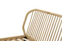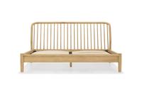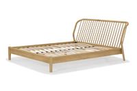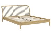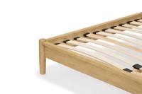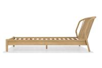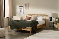This bed frame boasts a sleek contemporary design with subtle curves and rich tones. The headboard features a gentle curve, subtly arching away from the wall, creating a dynamic visual effect.