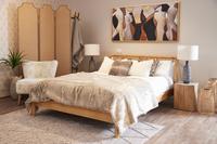 This bed frame boasts a sleek contemporary design with subtle curves and rich tones. The headboard features a gentle curve, subtly arching away from the wall, creating a dynamic visual effect.