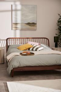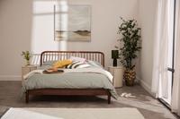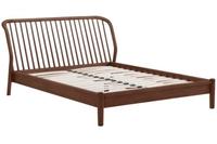 This bed frame boasts a sleek contemporary design with subtle curves and rich tones. The headboard features a gentle curve, subtly arching away from the wall, creating a dynamic visual effect.