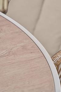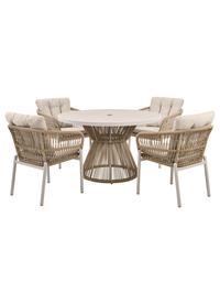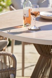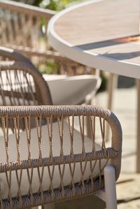 The glass table top is finished in an ash coloured wood effect, and the Olefin fabric is quick-drying and stain-resistant. All details of this set are of the highest quality and designed to withstand the elements.