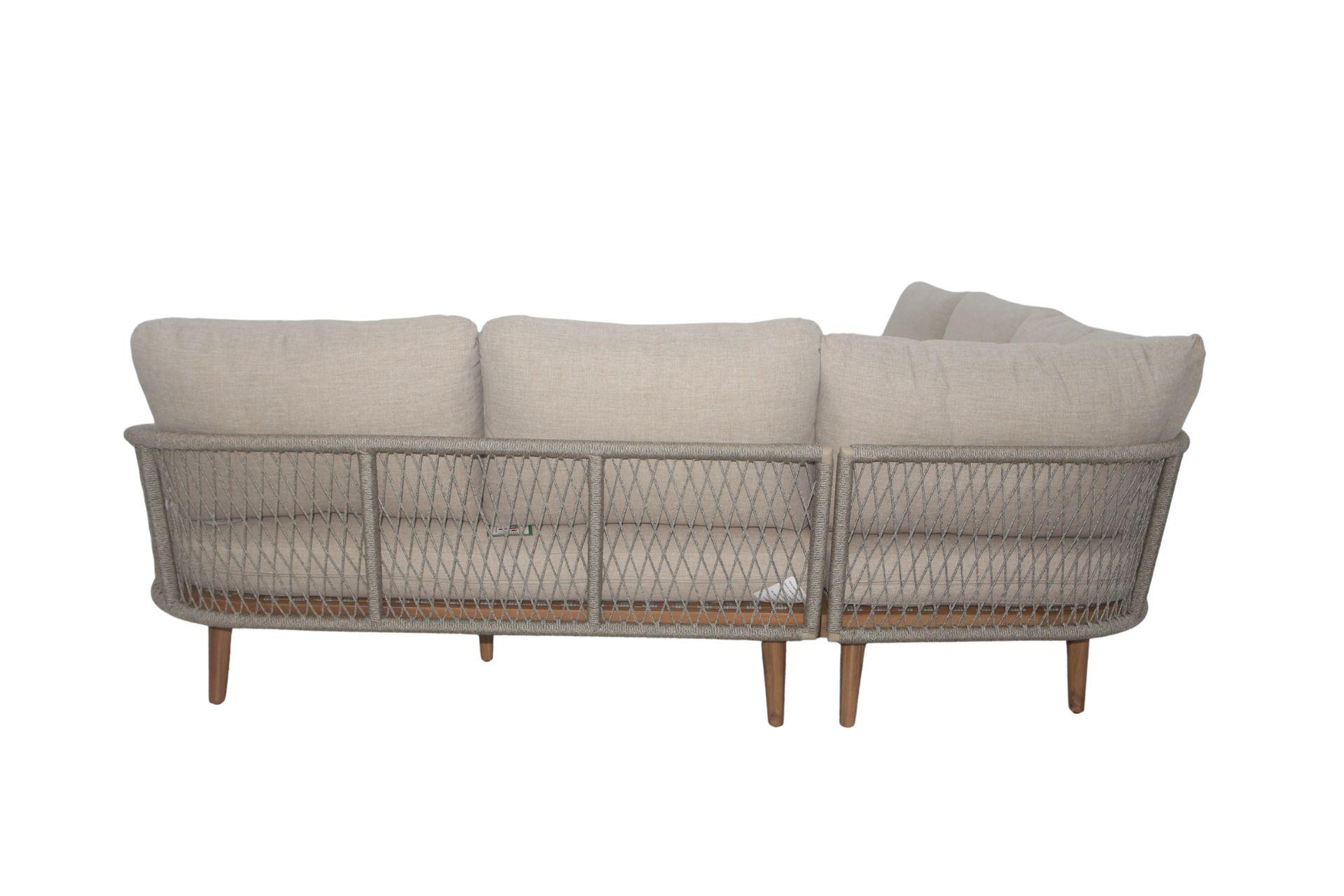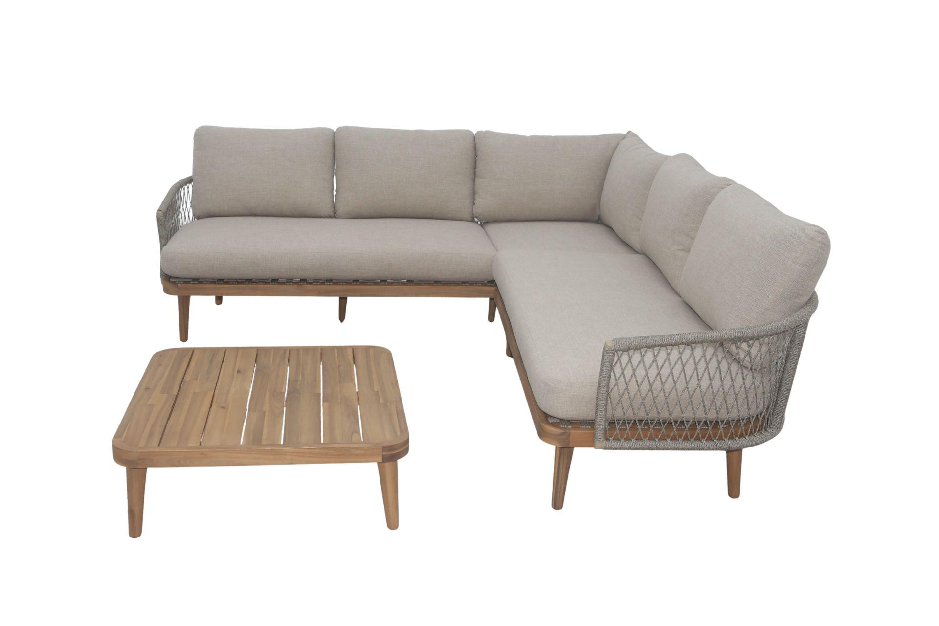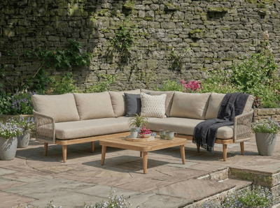 This beautifully coordinated set features a spacious L-shaped corner sofa with supportive cushions and a sleek low lounge table, perfect for relaxed gatherings, morning coffee, or evening drinks in the garden.