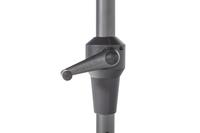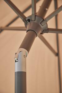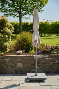 This parasol features a strong aluminium frame, base, and fabric canopy with tension springs that keep the fabric taught and secure. The setup is very user-friendly, with a wheeled base and easy-to-open canopy. The perfect shade solution.